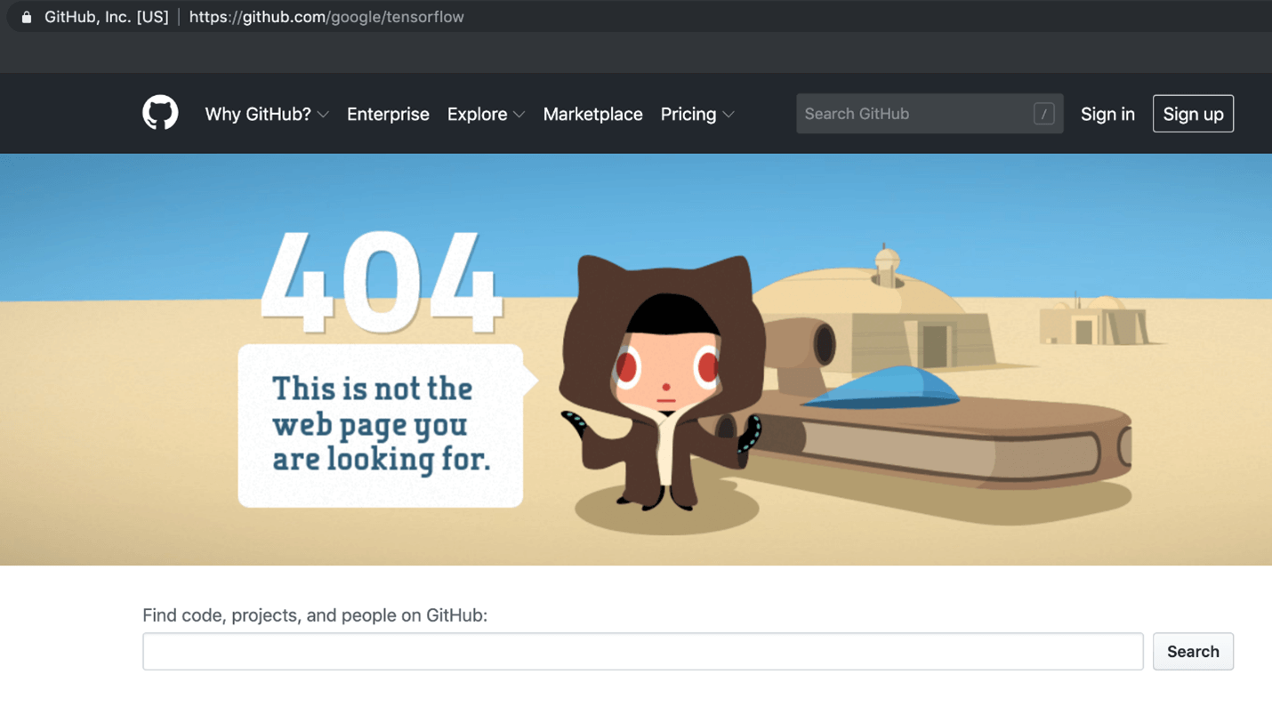 GitHub’s 404 page is not only informative but also entertaining. It features a cat in a space suit with the message, “404: This is not the web page you are looking for.” The humor aligns with GitHub’s developer-centric audience, making the experience more enjoyable.